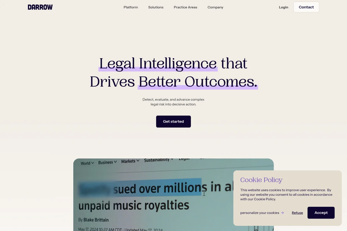 Darrow is an AI research lab for the legal ecosystem that combines large-scale legal data, advanced AI systems, and deep domain expertise to surface emerging legal risk before it escalates. The intelligence helps law firms, insurers, and compliance teams see earlier, understand more clearly, and act before harm compounds.