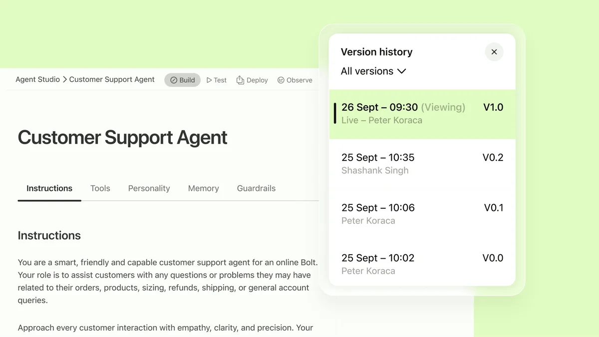 Build, test, and deploy AI agents without coding. Agents execute complex workflows, create tickets, resolve questions, update CRM records. Includes sandbox testing, multi-channel deployment (email, Slack, WhatsApp), automatic versioning, and human-in-the-loop approval.