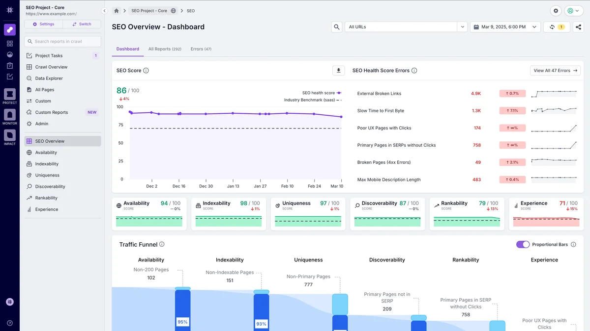 Lumar is 100% focused on website technical health with insights across technical SEO (including GEO), site speed, accessibility, performance and more. It's the only platform that mitigates traffic loss risk with automated QA testing and comprehensive trend tracking, and provides single-view dashboards for monitoring multiple domains. The cloud-based crawler is the fastest available at up to 450 URLs/s, much larger than software-based crawlers. It also provides high customization and control for experienced users.