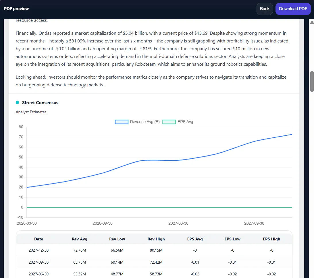 Generate structured market reports (Daily Brief or Single Stock deep dive) with sections for overview, recent news, financials, street consensus, catalysts, risks, and action items—exportable as PDF or shareable link.