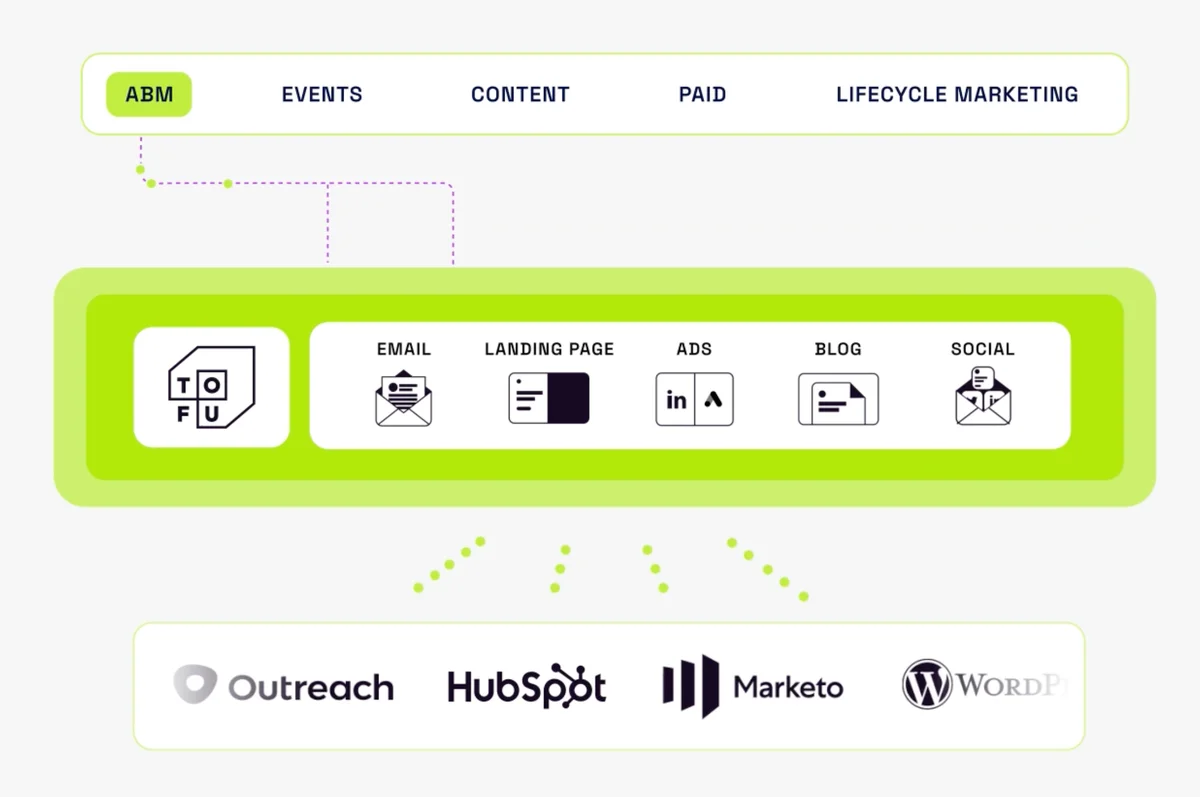 Tofu integrates with all the tools you use including Salesforce, HubSpot, and Marketo. It works with your existing marketing stack including your website, email tools, and ad platforms to execute campaigns.