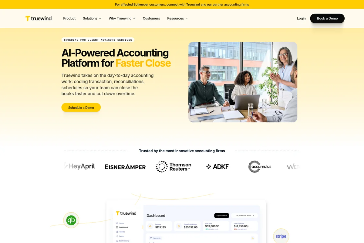 | [2] | What is Truewind | Truewind is a SOC 2 Type 2 certified AI-powered accounting platform that automates transaction categorization, reconciliations, and month-end schedules. Trusted by 500+ accounting firms and startups, it reduces categorization time by 75% with pricing from $300-2,000/month. |